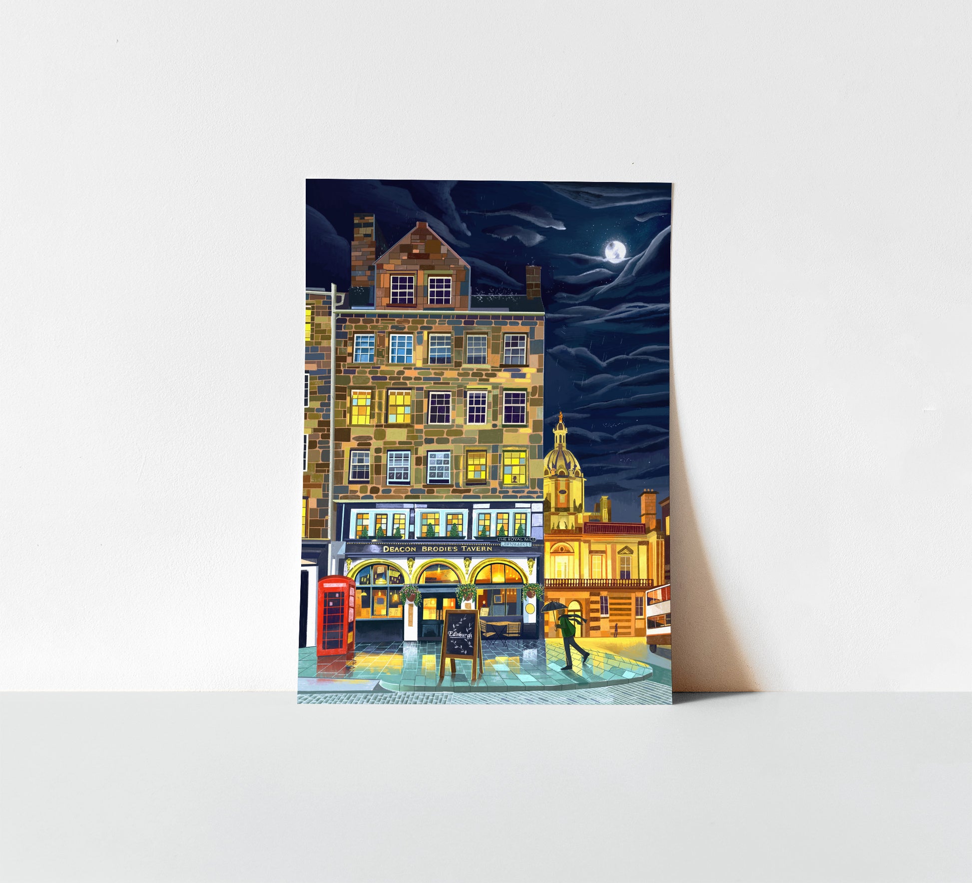 Edinburgh Royal Mile featuring Deacon Brodie's Tavern on Lawnmarket, along with a view of the Bank of Scotland on a soft rainy evening. The digitally illustrated print is an ideal piece for any art or beer enthusiast, as well as admirers of Edinburgh's deep-seated history.