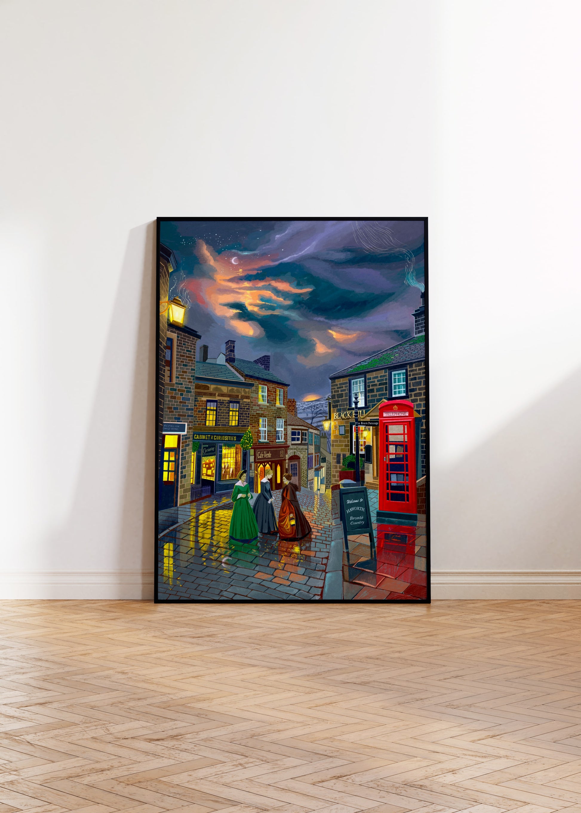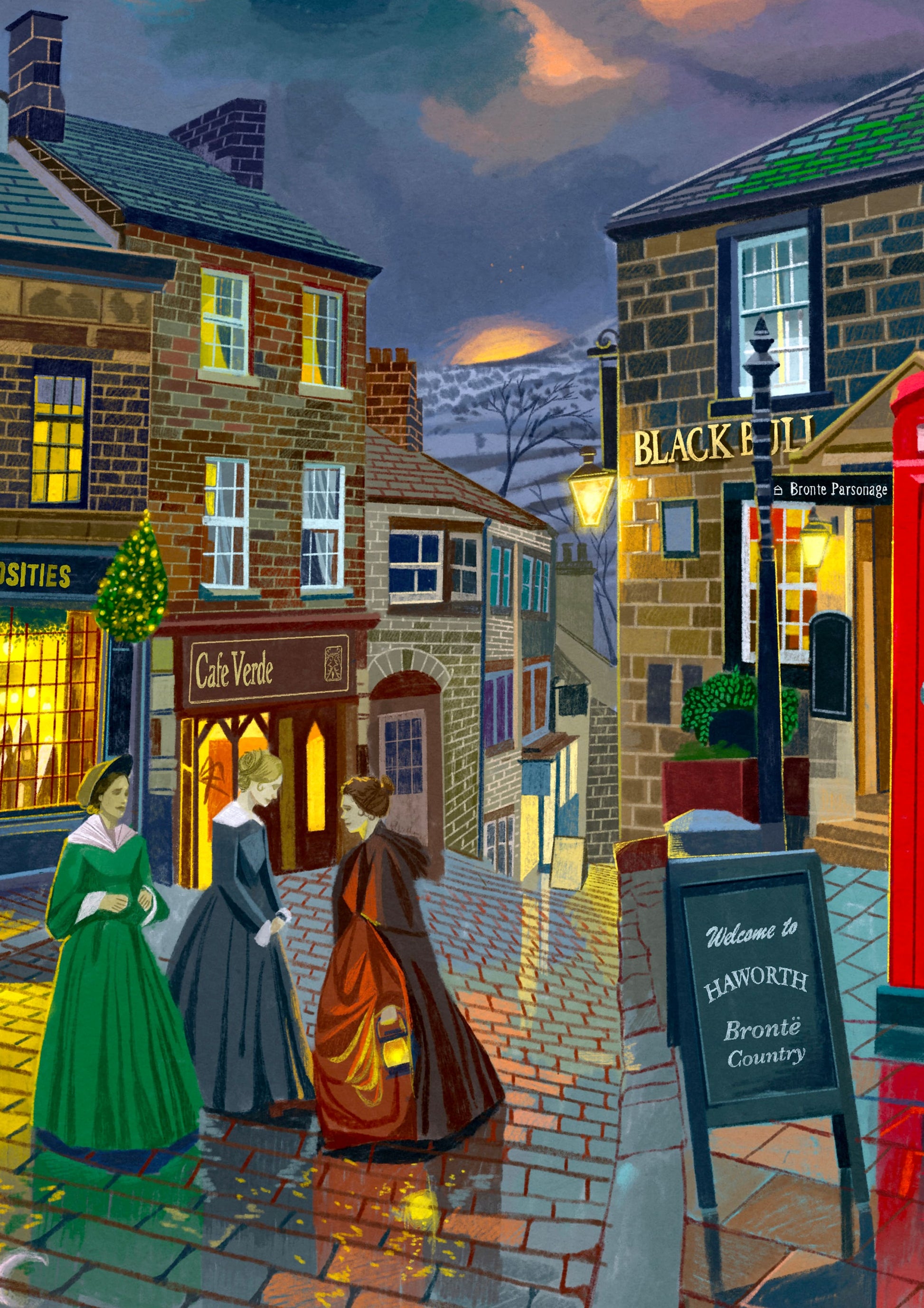 Haworth, Main Street, West Yorkshire, Brontë Country. Featuring The Black Bull Pub, The Cabinet of Curiosities and Cafe Verde, as well as a peaking vista of the misty Worth Valley in the Pennines. This wintry scene depicts Haworth at dusk, as three women inspired by the Brontë sisters huddle together on the rain soaked cobbles. Just a couple of minutes walk from the Bronte parsonage museum, this illustration celebrates the legacy of the Brontë family as well as Haworth's Victorian charm.