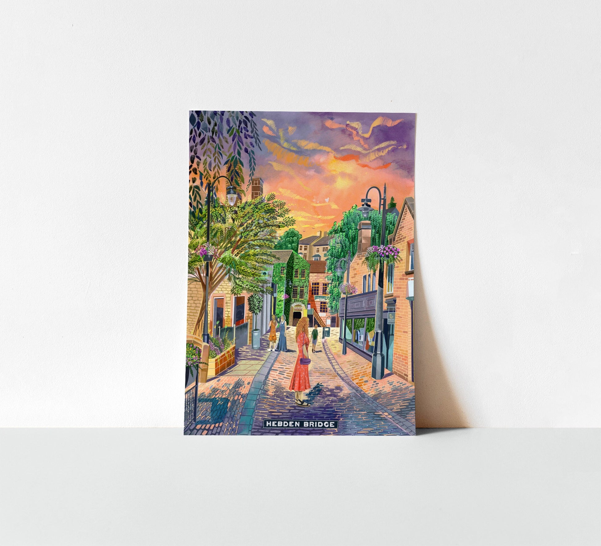 Hebden Bridge, Bridge Gate. This original illustration features a selection of the thriving independent shops, cafes and pubs in the town centre including Hebden Bridge Mill, Shoulder of Mutton and Coffee Cali.