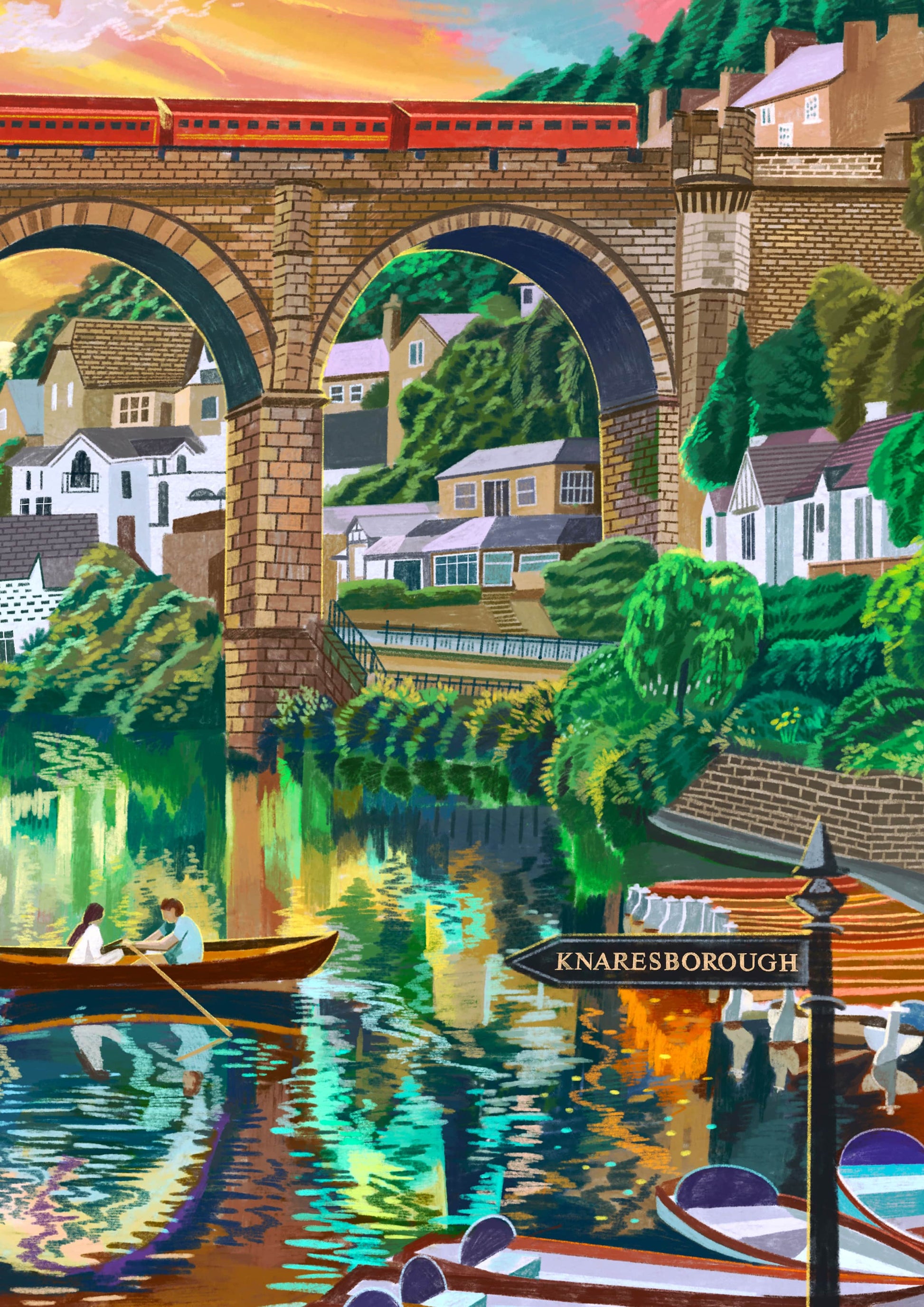 This viewing spot is just 10 minutes from Knaresborough station and can also be viewed from above at the Knaresborough Castle and Courthouse Museum. You can also rent a boat yourself to explore the River Nidd from the Marigold Cafe and Boat Hire on the banks of the river as seen in the artwork.