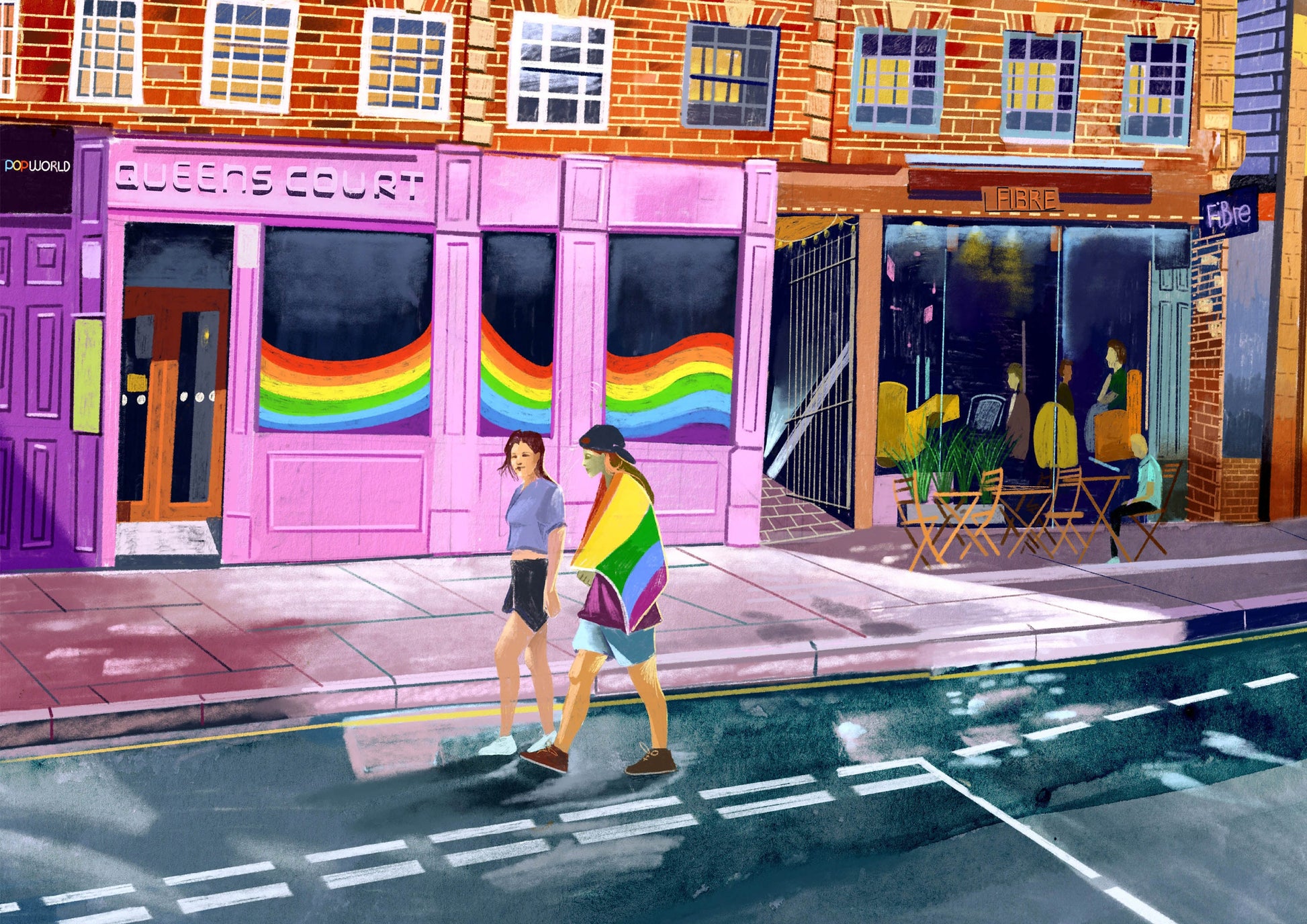 Leeds June Pride Artwork Print, featuring Viaduct Showbar, Fibre, Queens Court and Popworld on Lower Briggate.