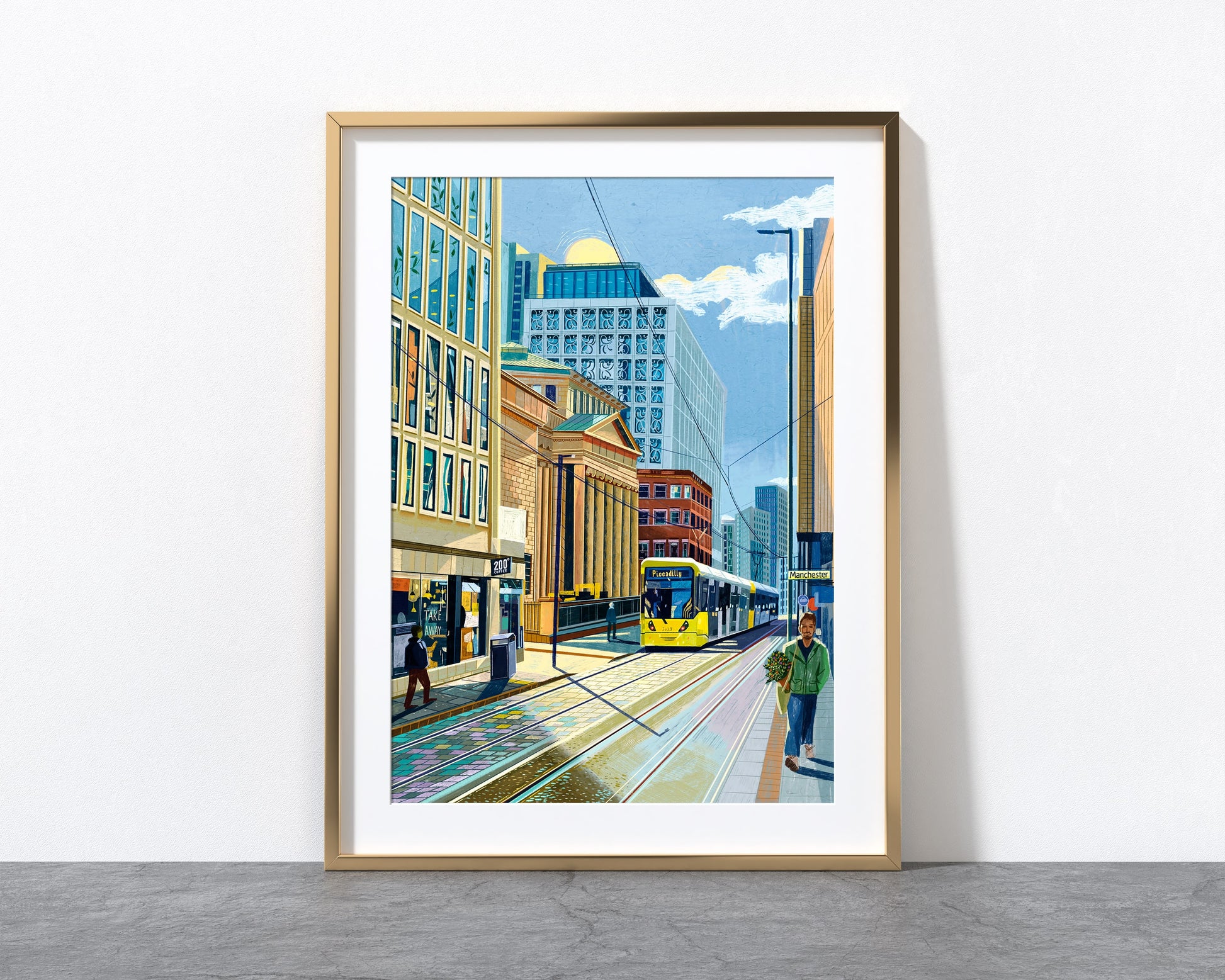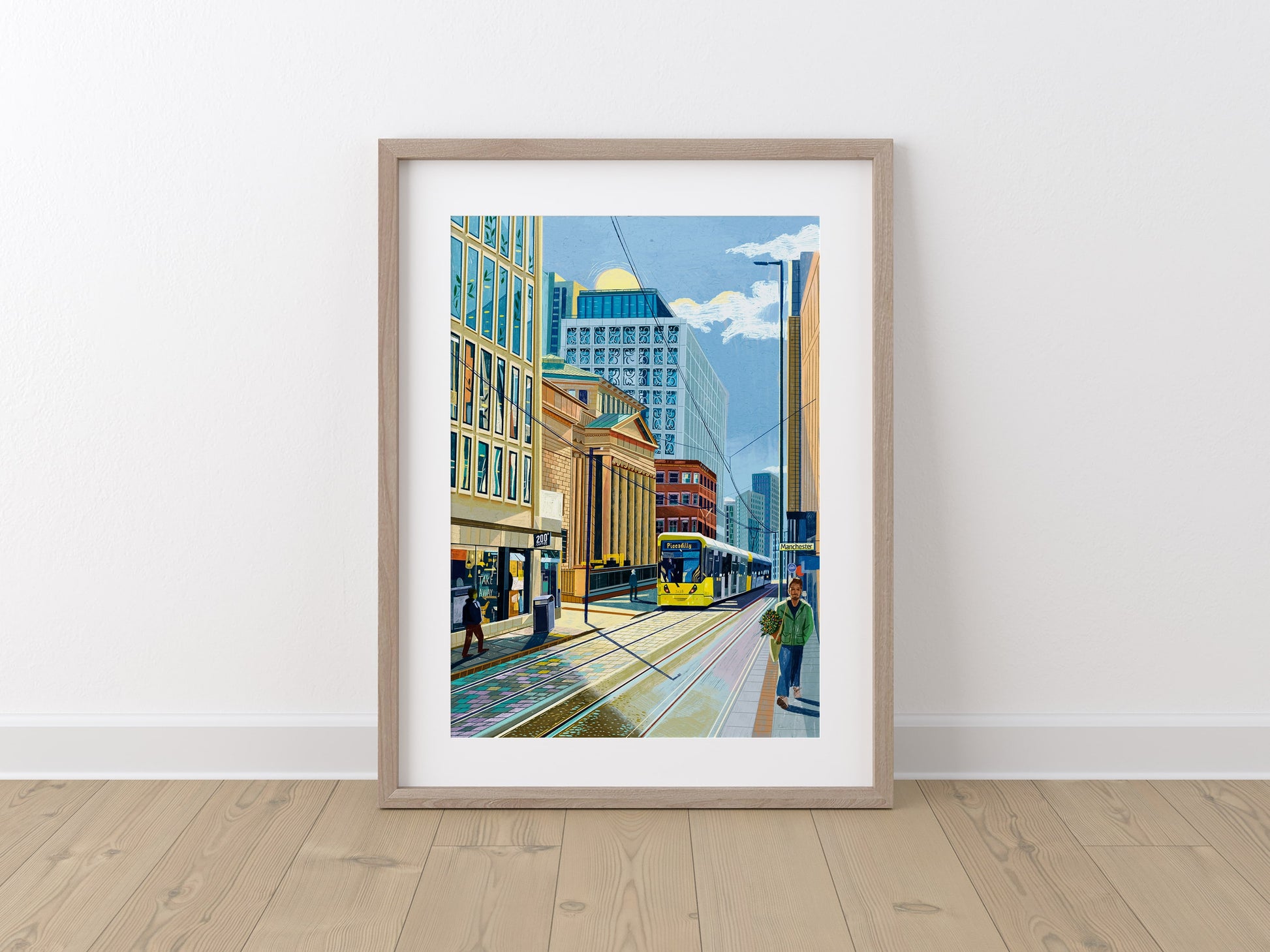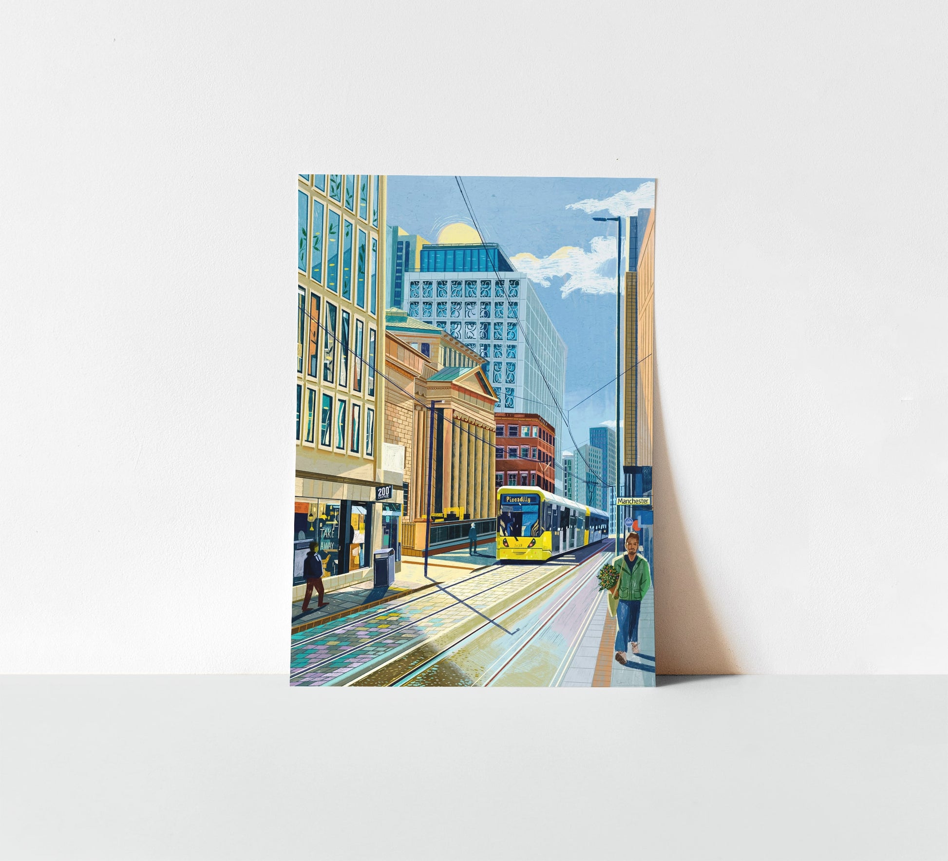 Mosley Street Manchester looking toward St Peter’s Square and featuring the grand facade of Manchester Art Gallery, a beautiful Grade II* listed building built in 1835. This bright cityscape illustrated with iPad Procreate also includes a Piccadilly bound Metrolink tram as well as 200 Degrees Coffee and Two St Peter's Square.