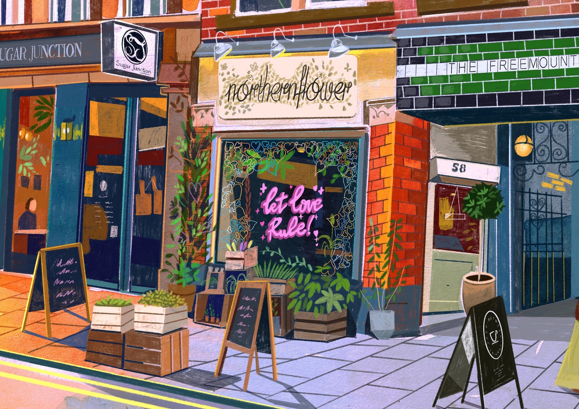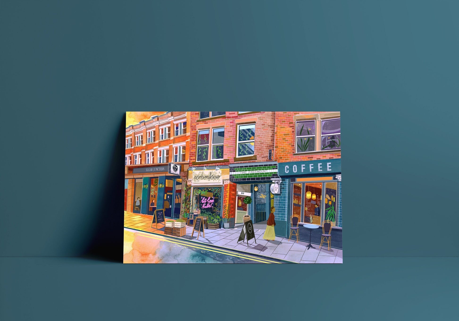 Manchester, Northern Quarter, Tib St. This trendy neighbourhood scene features the popular Northern Flower, easily recognisable as one of the most beautiful shop-fronts in Manchester. Also including Just Between Friends Coffee, The Freemount and Sugar Junction, this print is a fantastic way to celebrate the vibrancy of some of Manchester’s finest bars and shops.