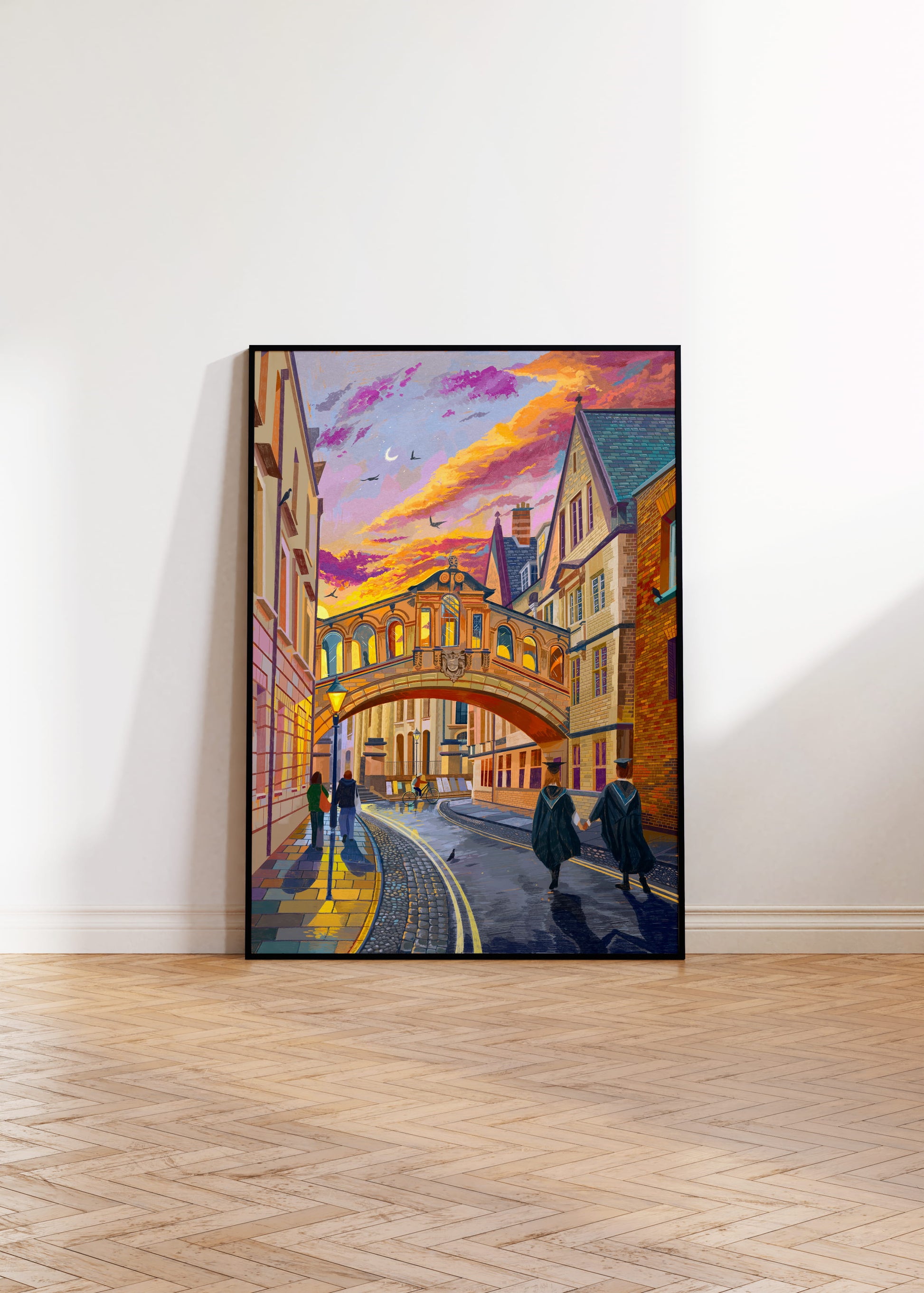This detailed iPad Procreate illustration took 26 hours to create, hand drawn from the Zac's own photographs and sketches from start to finish. The scene features graduates walking beneath the bridge and a cyclist passing the Sheldonian Theatre in the background. This illustration makes a perfect gift for Oxford graduates, students, alumni and lovers of historic university cities.