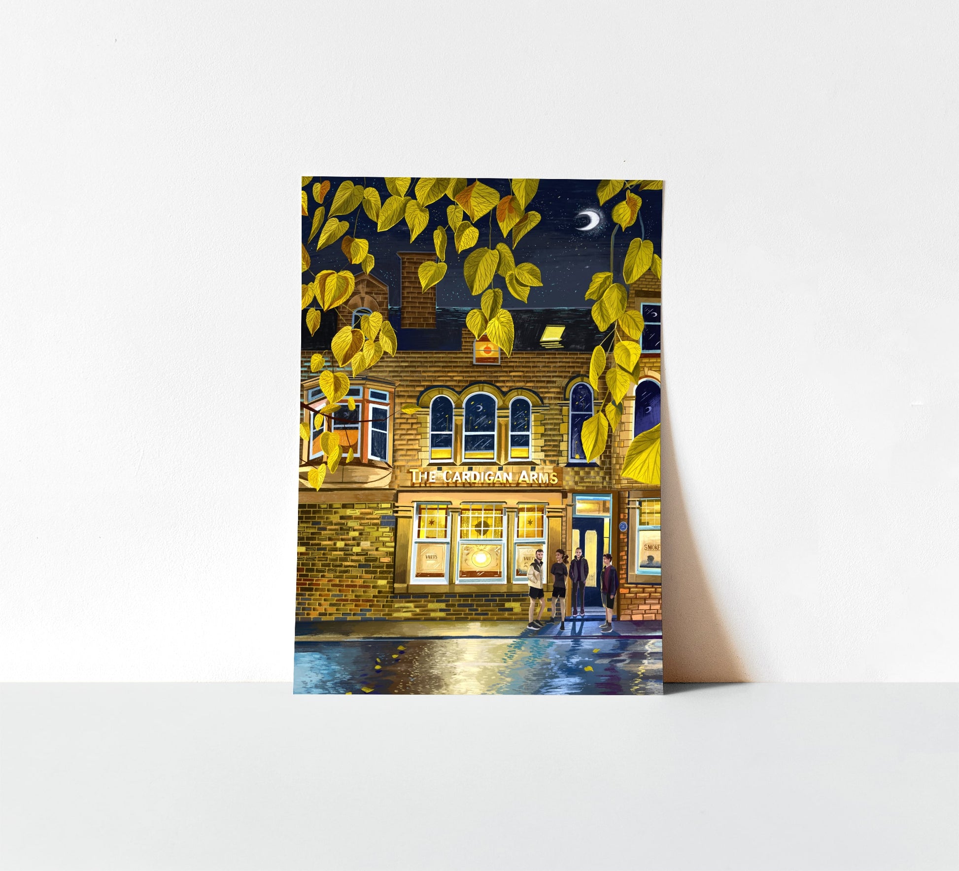 The Cardigan Arms, as viewed from Kirkstall Road on an autumn night. This digital illustration features the beautiful Victoria era front with its ornate details and the warm glow from the inside. Much loved by the people of Leeds and Burley in particular, this wonderfully maintained old style pub is rich with Leeds history and well used today as one of the popular Kirkstall Brewery Pubs.
