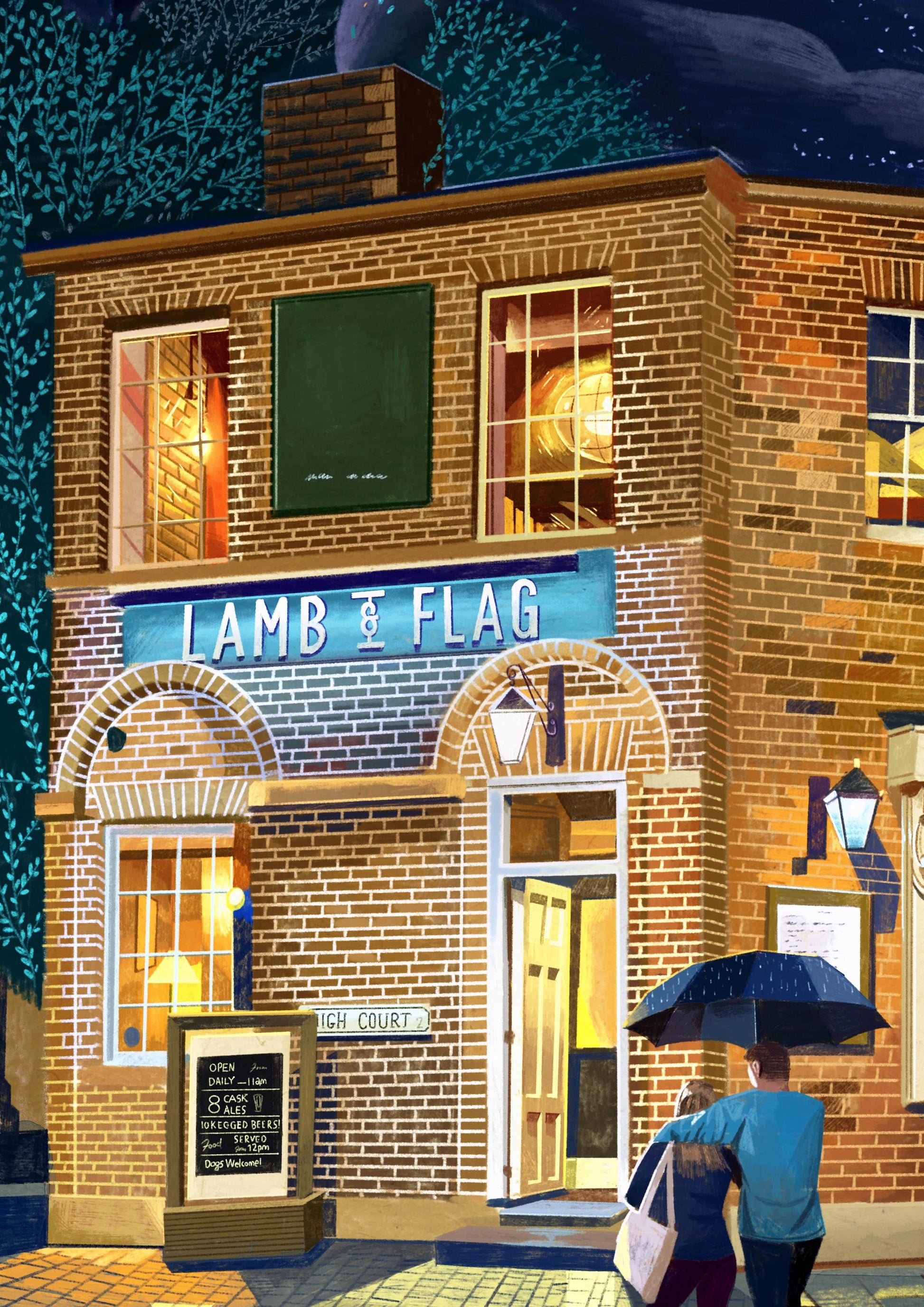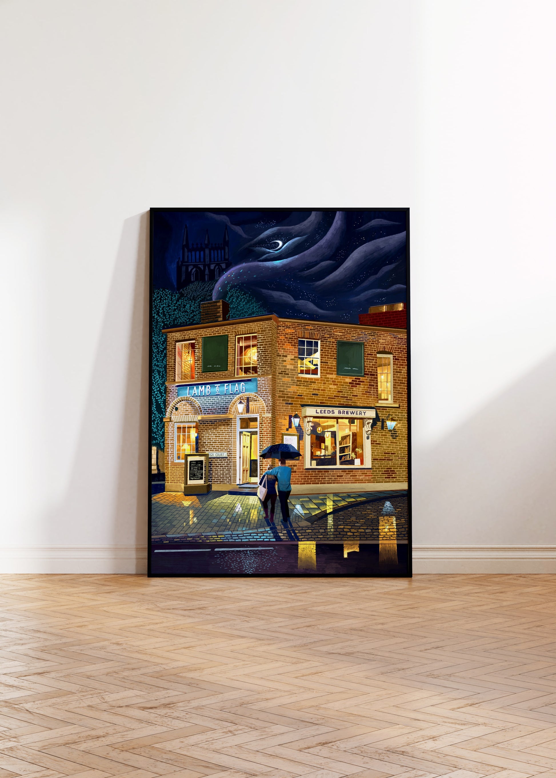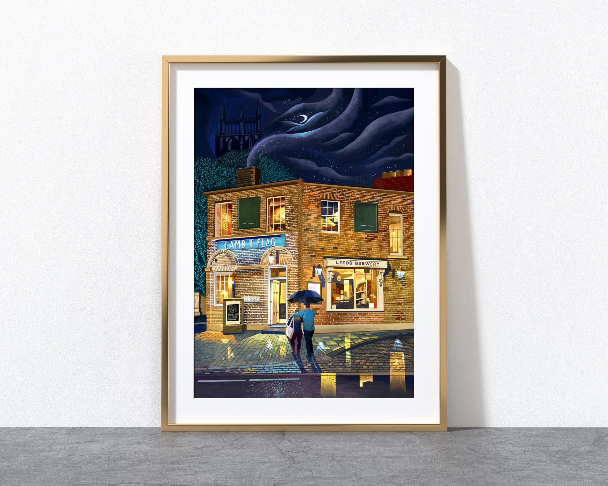The Lamb and Flag, 1 Church Row, Leeds. This beautiful pub was restored to its original red brick facade in 2015 and was dubbed by the Yorkshire Evening Post as one of the cosiest pubs in the city. They’re well known for their Sunday Roasts and are apart of the Leeds Brewery, an independent business based in Leeds. This artwork makes a perfect gift for any Leeds lover of pubs, beer, good times or colourful prints.