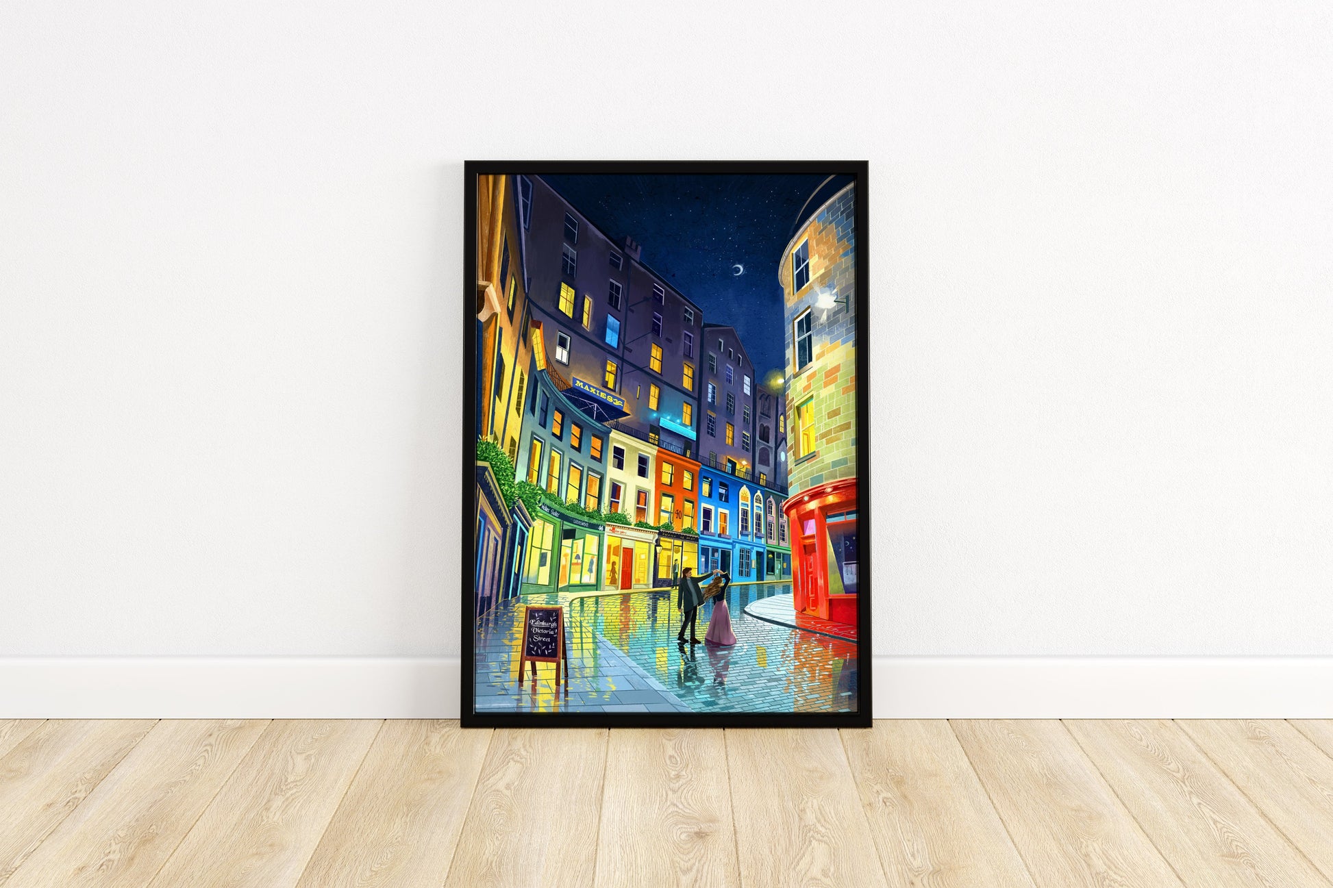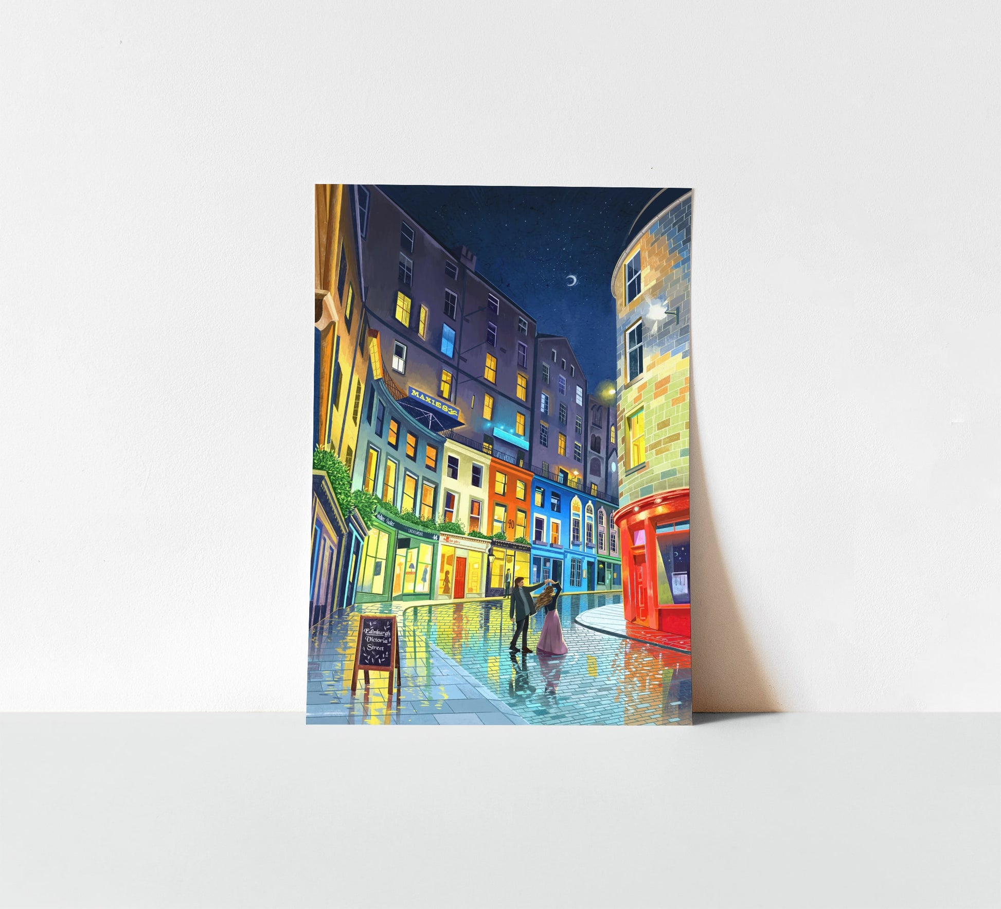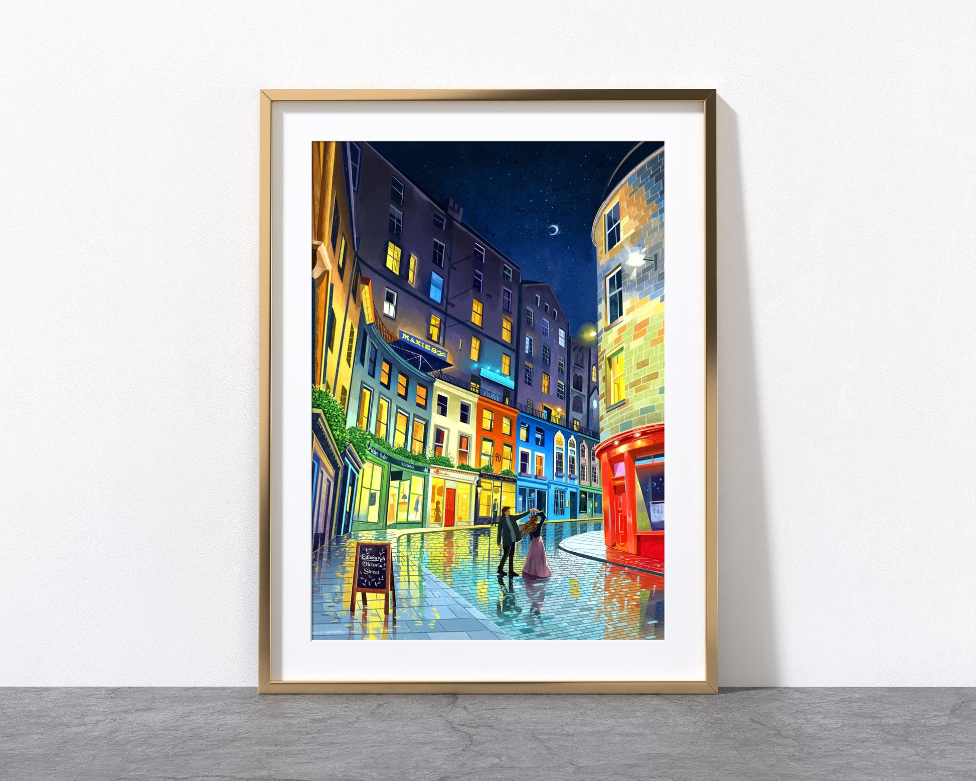 Add some dazzle and enchantment to your home or business with the latest hand signed Zacrosso Edinburgh print. This romantic scene features the famous Victoria Street known for its upwards curve, colourful shop fronts and magical charm. This digitally illustrated iPad painting has been captured by the artist on a rainy evening set against a moonlit sky as two revellers dance on the soaked cobbles.