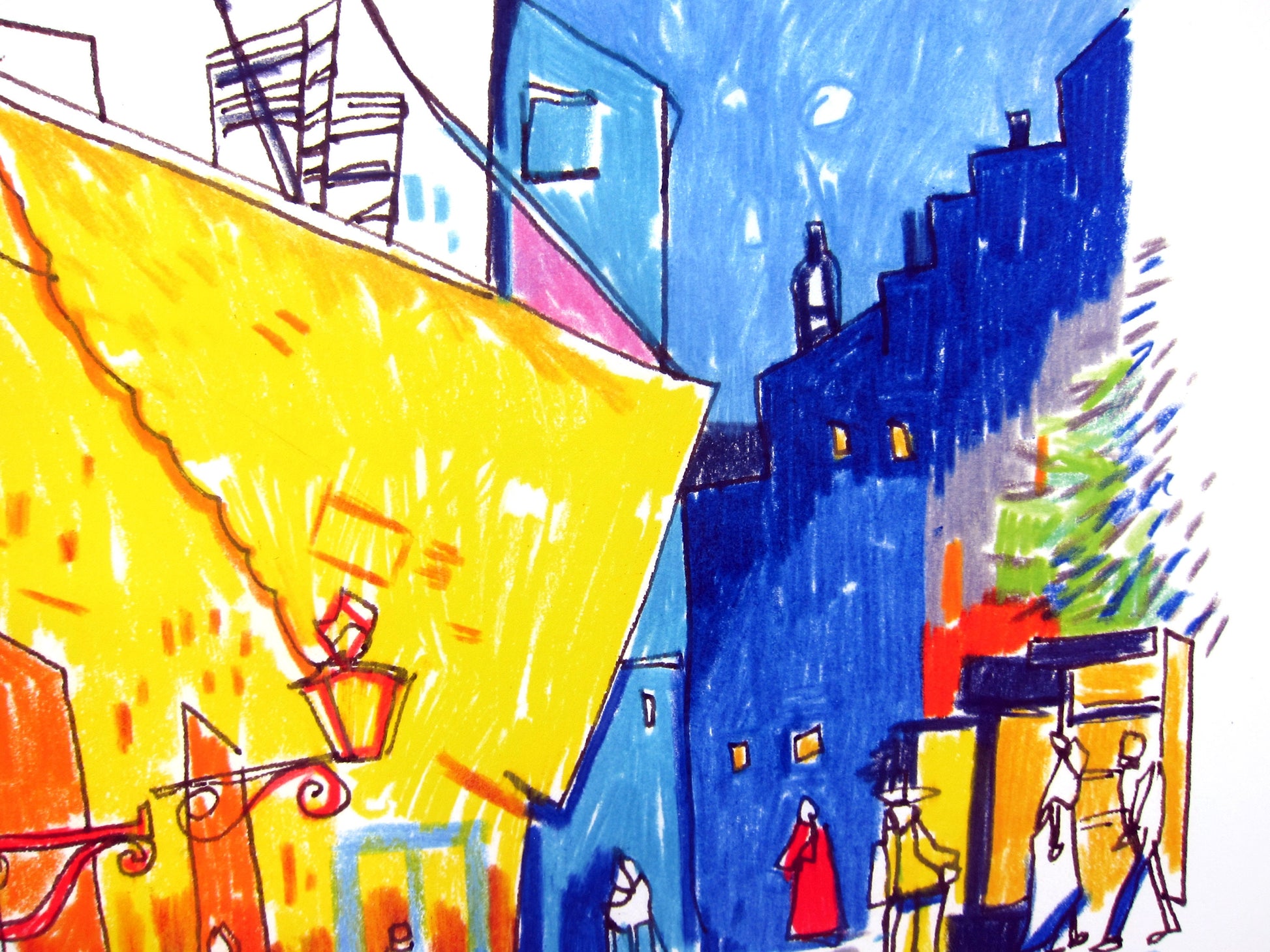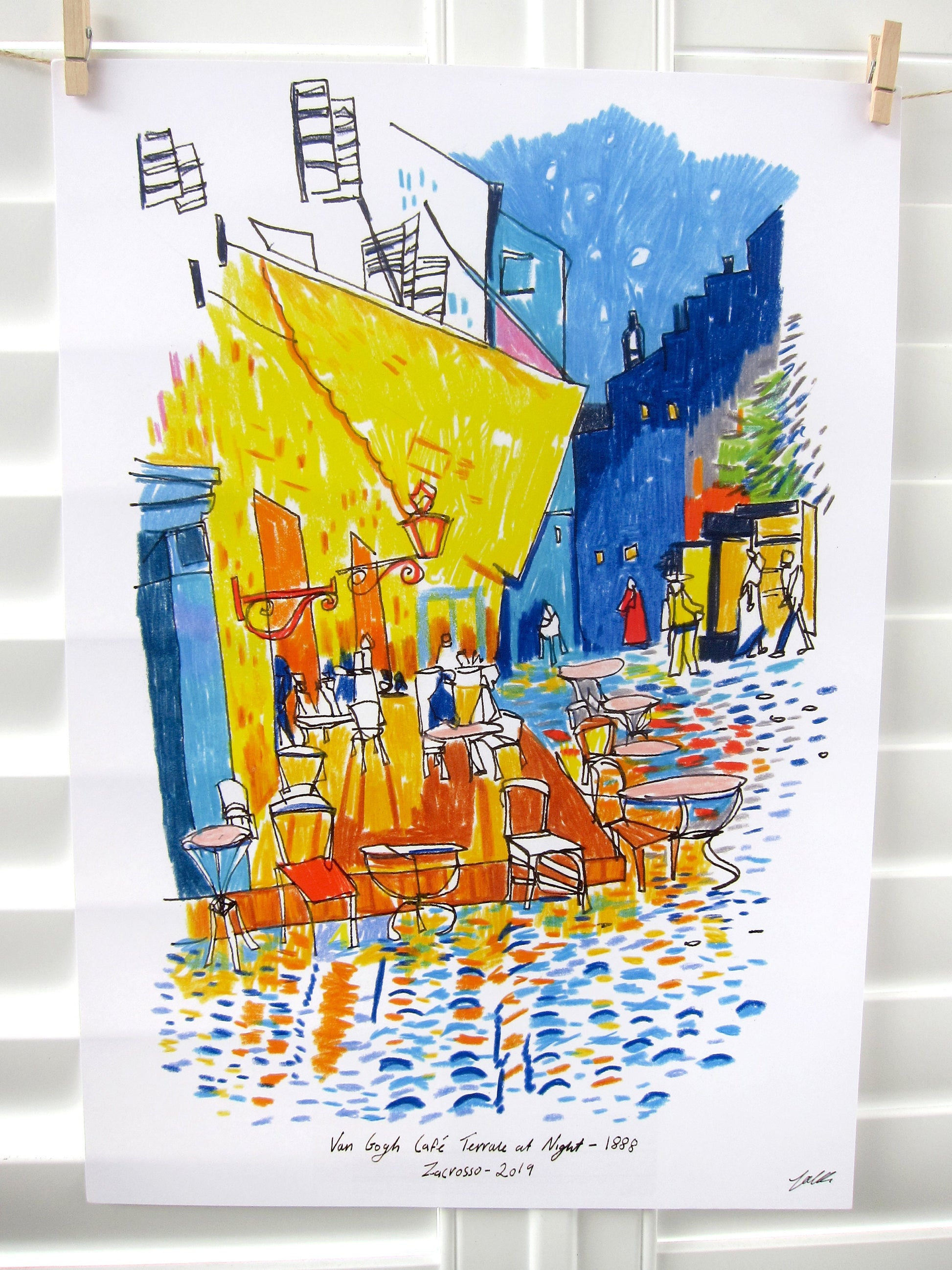 An illustrative take on Vincent Van Gogh's 1888 Café Terrace at Night as apart of a series exploring Impressionist artworks