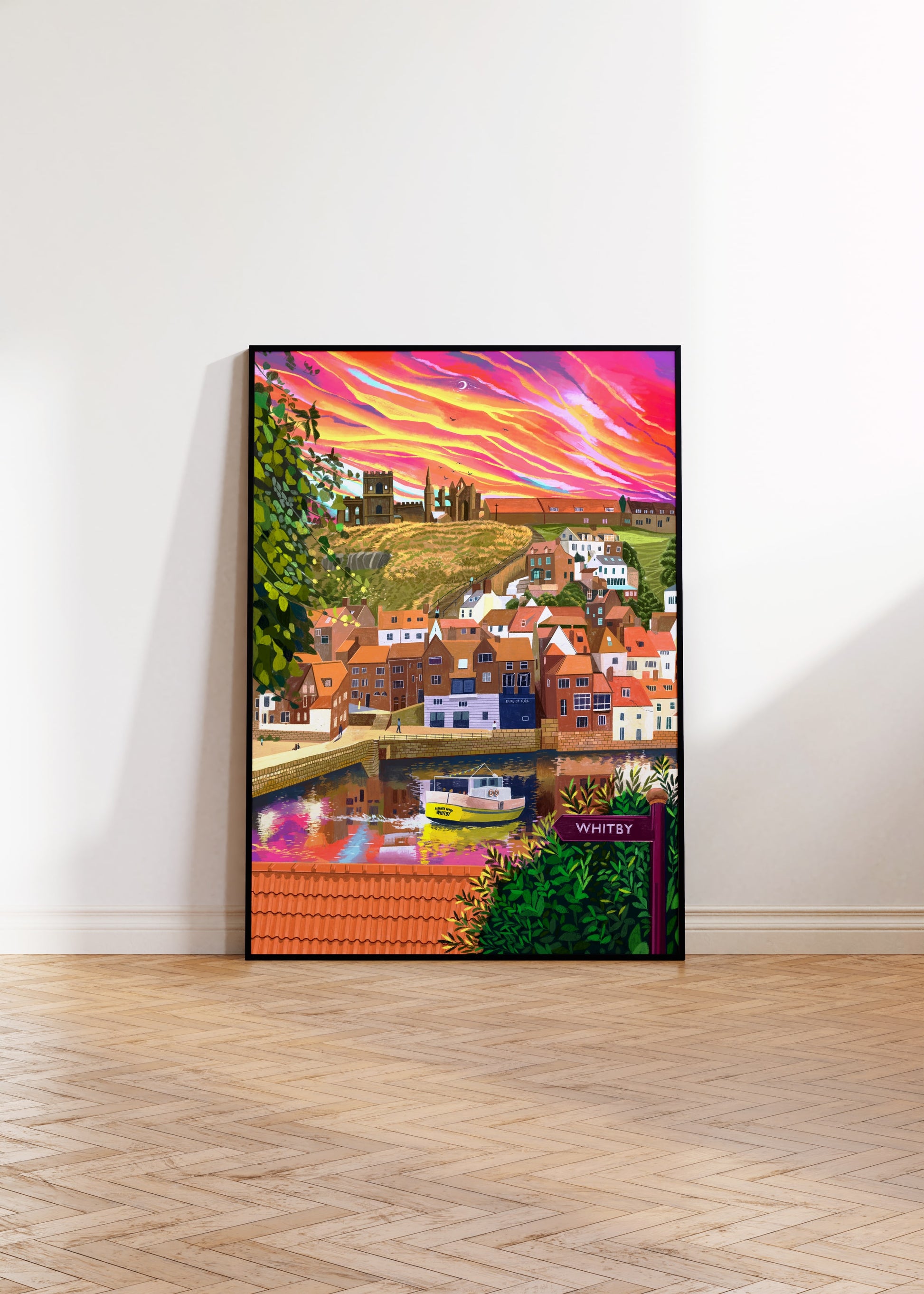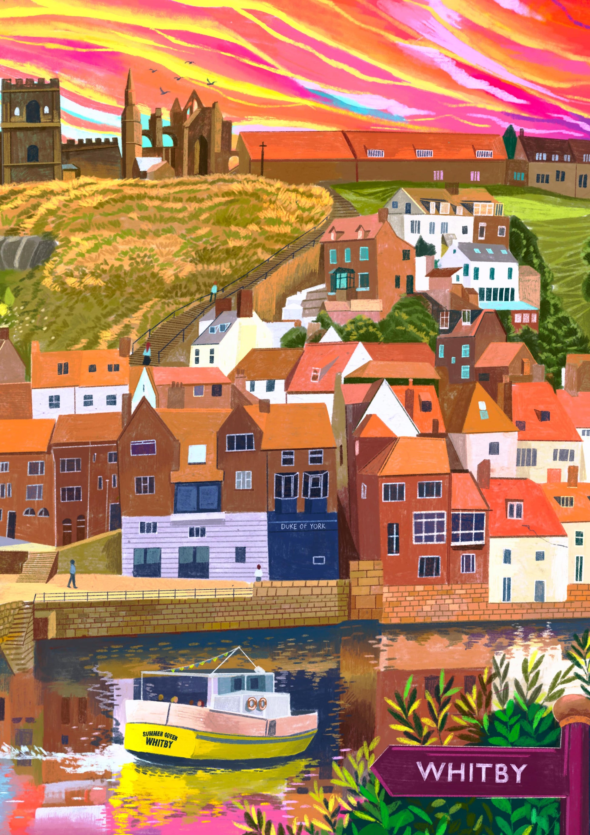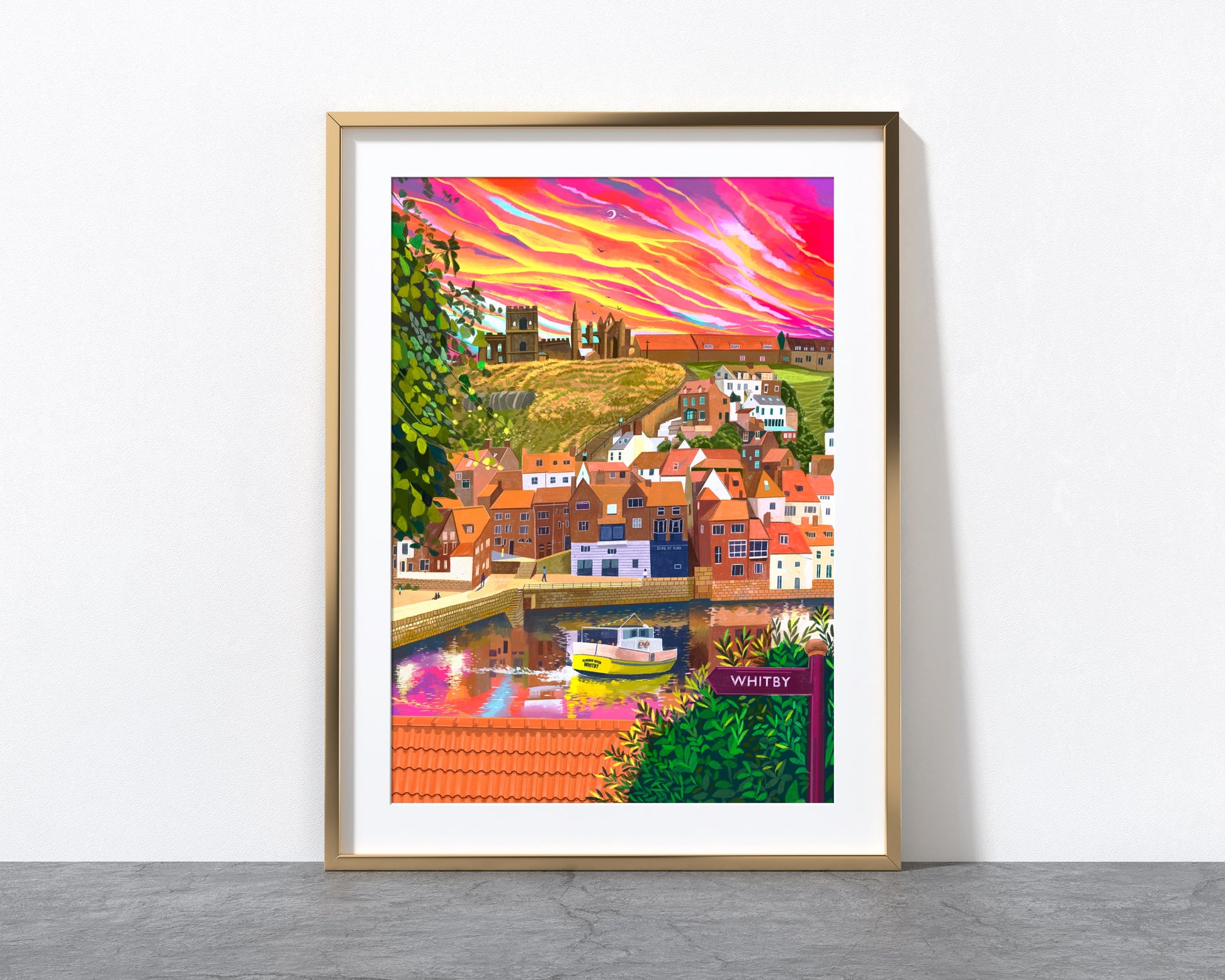 Whitby, the jewel in the crown of the Yorkshire Coast. This digitally illustrated artwork scene depicts Whitby Abbey, St Mary’s Parish Church and the picturesque old town on the East side of the town. This view seen from 'The Screaming Tunnel' also known as Dracula's Tunnel, can be reached by following the West Cliff towards Khyber Pass. This beautifully framed view of the town has been captured as the Summer Queen from Whitby Coastal Cruises sails back to port with it's visitors aboard.