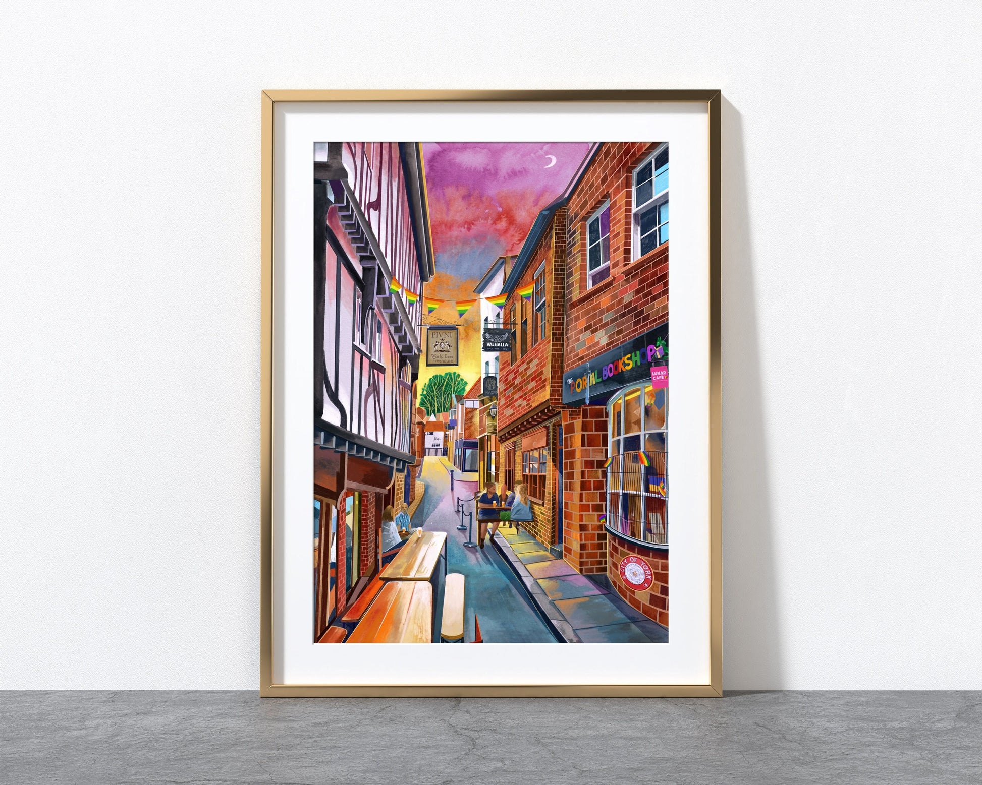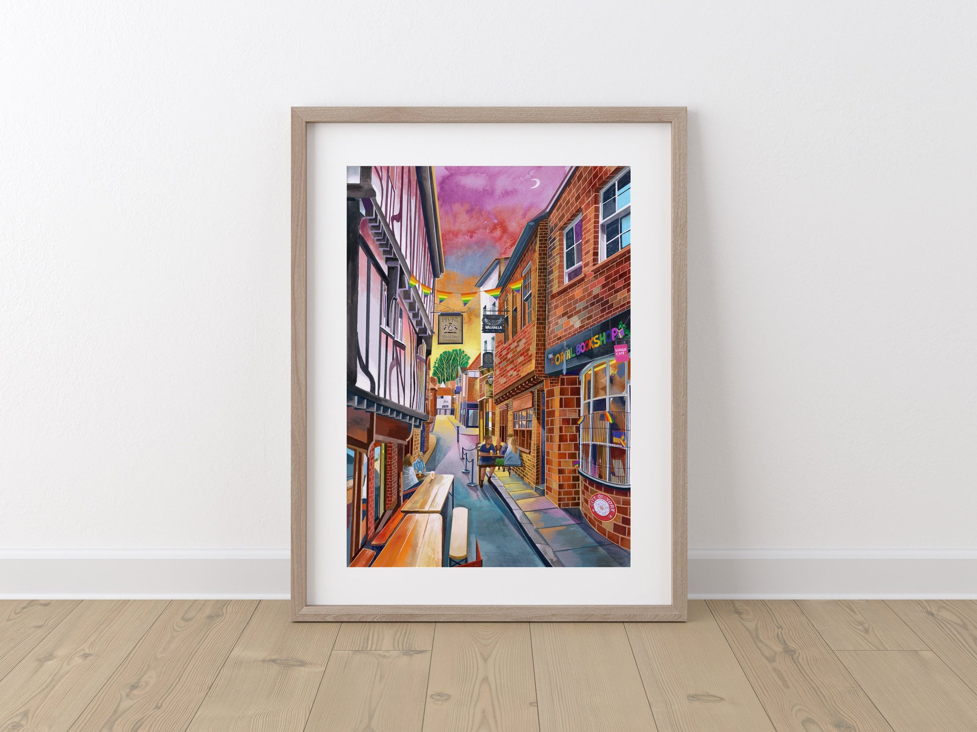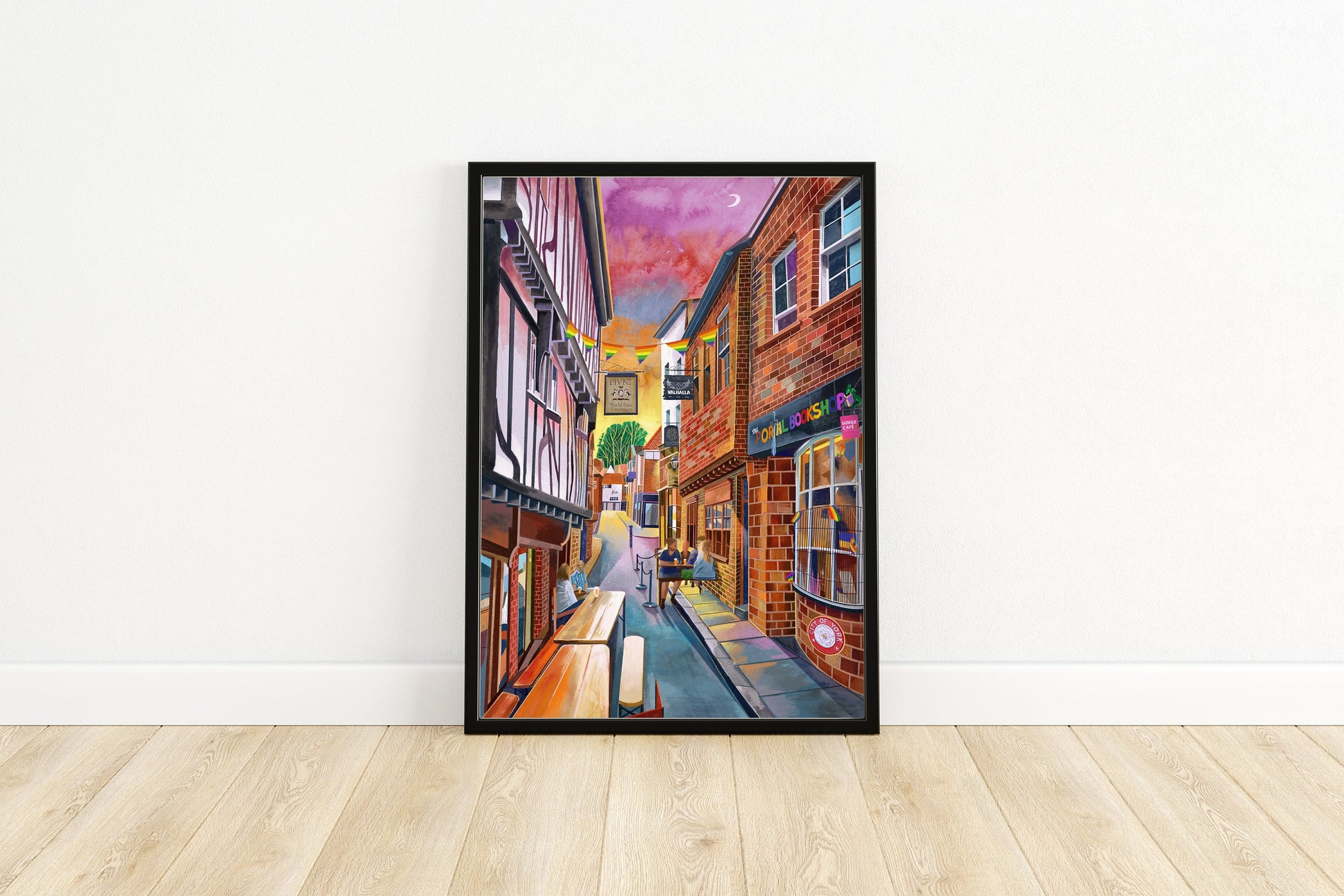 York Artwork print featuring Patrick Pool street looking onto Swinegate street. This full colour print includes a number of popular York destinations, including the LGBTQIA+ Portal Bookshop, Valhalla Bar, Pivni Beer Crafthouse and Hocus Pocus Tiny Hotel. This York travel poster would make a fantastic accompaniment to any student flat accommodation, local business, home décor or as a York themed gift.