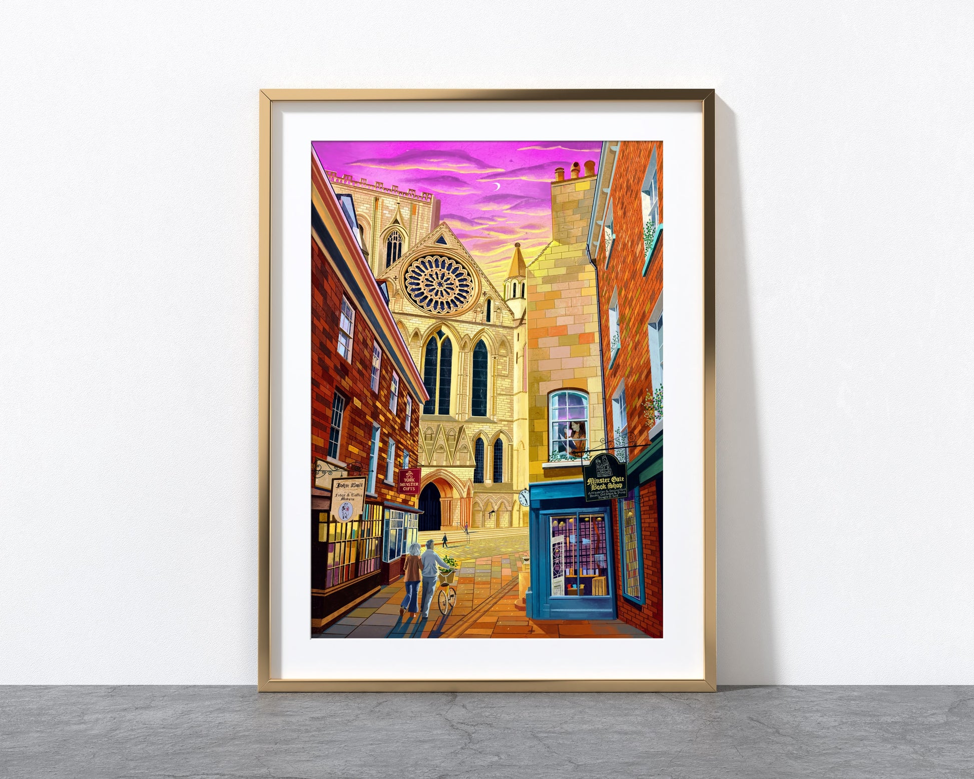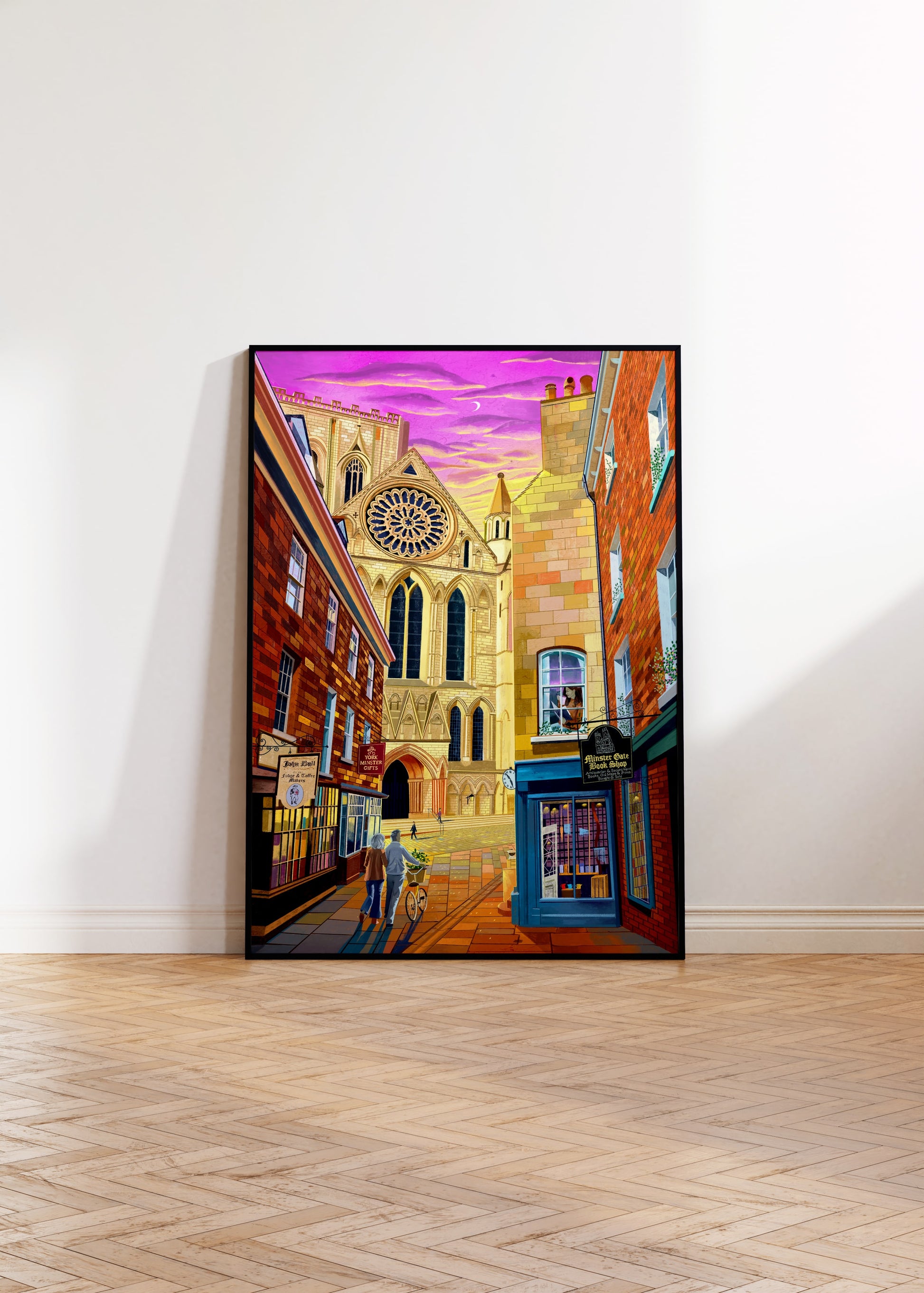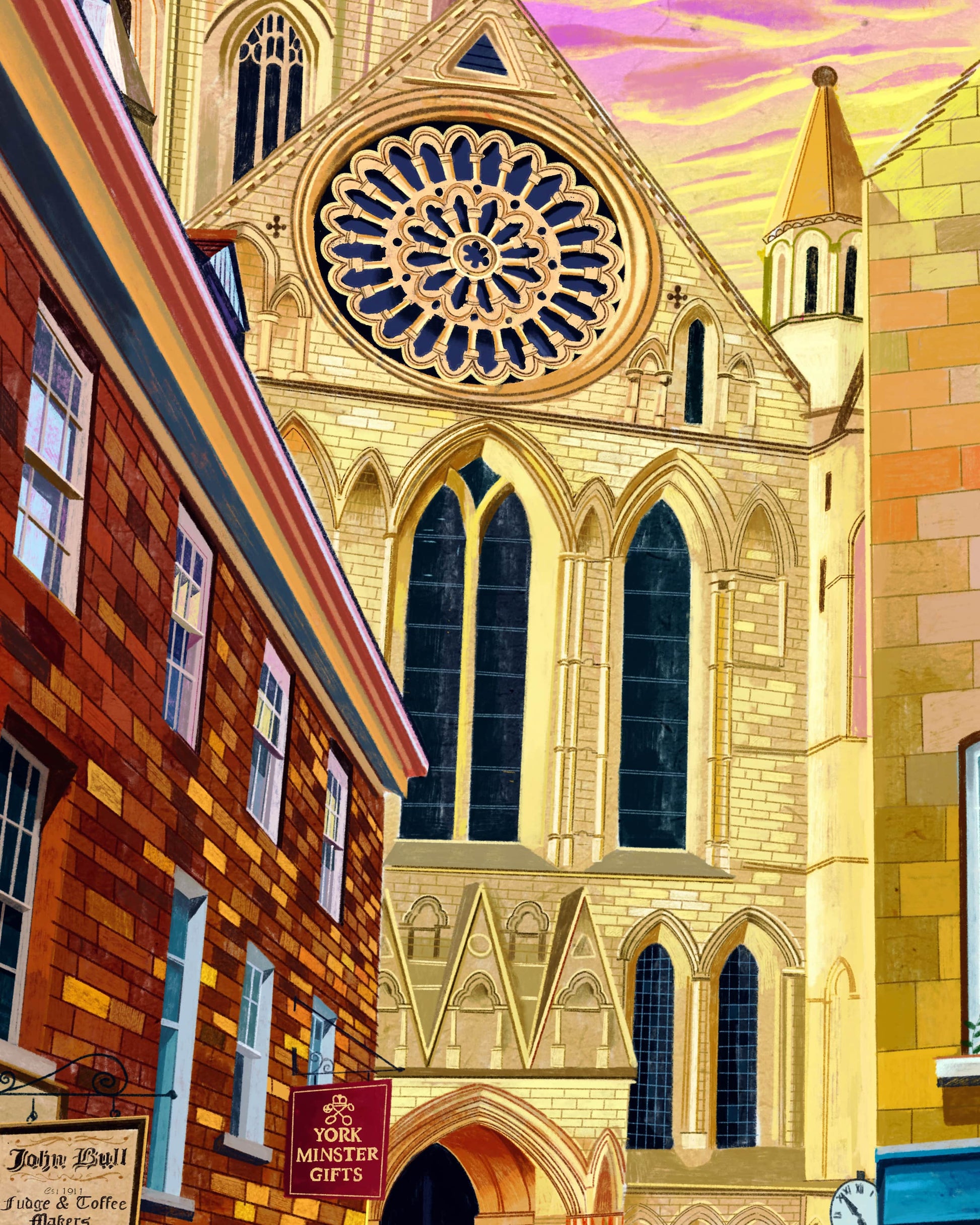This artwork print features a perspective of the world-famous York Minster from the vantage point of Minster Gates on Stonegate. The illustration shows the minster during a sunset scene, bathing the historic cathedral and surrounding landscape in warm hues. Digitally painted using iPad Procreate, this print includes the quaint charm of the Minster Gate Bookshop, Hebden Tea, John Bull York, and York Minster Gifts. The meticulous detail and vibrant colours transport you straight to the heart of historic York. Each print comes hand-signed, adding a personal touch to this piece of art. It's more than just a print; it's a snapshot of a beloved corner of York, captured in a moment of time.